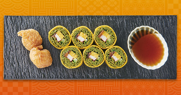 新商品!抹茶の風味が香る茶そばを、薄焼き玉子で巻いた、彩り鮮やかな新感覚メニューです。めんつゆをつけてお召し上がりください。