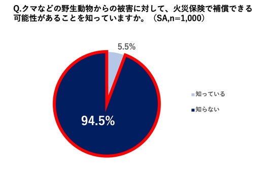 ・クマによる建物被害が火災保険で補償できる可能性があることについて、94.5%が「知らない」と回答。