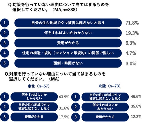 対策を行っていない理由として、全体では「自分の住む地域でクマ被害は起きないと思う(71.8%)」という回答が最多ですが、出没多発地域では、「何をすればよいかわからない」という声が、東北で43.9%、北陸で35.6%と多い結果となり、対策方法がわからないため「無対策」となっている状況もうかがえました。