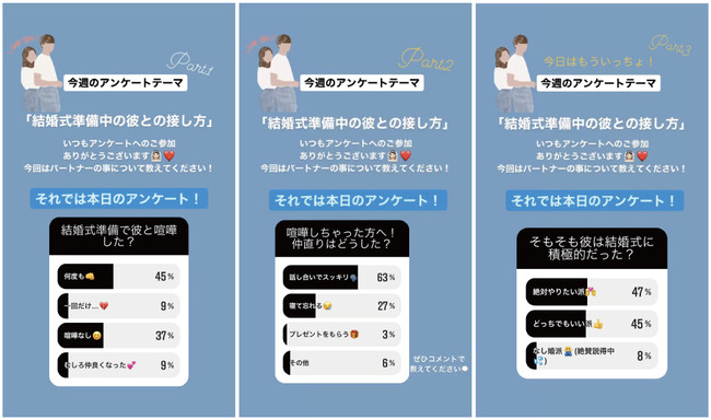 アンケート方法はインスタグラムのストーリーズを用いていますが、性質上(回答後その時点でのアンケート結果がパーセンテージで表示される)、プレ花嫁にとって興味深い質問は回答が集まり、興味がない・回答しづらい、という質問は回答数が少なくなります。