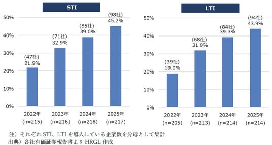 - 業績評価指標として将来財務指標を採用する企業は年々増加しており、STIは98社(45.2%)、LTIは94社(43.9%)に達している