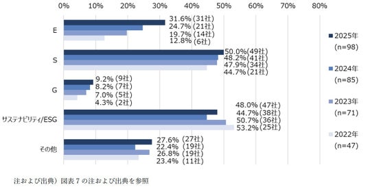 同様に、LTIの場合は、2025年は「E」が55社(58.5%)と最も多く、次いで「サステナビリティ/ESG」が52社(55.3%)となっています(図表7)。経年での変化をみると、「E」「S」「G」の個別テーマが前年比で増加している一方、「サステナビリティ/ESG」は4年間で年々減少しています。