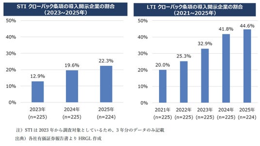 - STI、LTIともに、クローバック条項の導入を開示している企業は年々増加しており、STIでは約2割、LTIでは4割超となっている