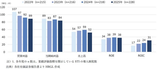 STIの支給額決定に用いる業績評価指標として採用されている財務指標*1上位5種類をみると、営業利益(89件)や当期純利益(84件)、売上高(52件)といった利益や収益に関連する指標の採用が多く、次いでROE(38件)やROIC(31件)といった資本効率性指標*2の採用が多くなっています(図表3)。利益や収益に関する指標の割合は未だ多数を占めているものの、その割合は横ばいまたは減少傾向となっています。一方、ROICの採用割合は増加傾向にあります。