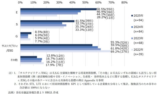 また、STIの業績評価指標として将来財務指標を採用している企業を対象に、テーマ別(E(環境)、S(社会)、G(ガバナンス)、サステナビリティ/ESG、その他)*4の採用割合をみると、「S」が49社(50.0%)と最も多く、次いで「サステナビリティ/ESG」が47社(48.0%)となっています(図表6)。経年での変化をみると、「E」「S」「G」の個別テーマの採用割合が年々増加しています。