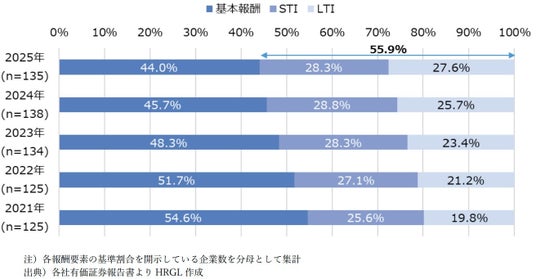 - 報酬ミックス(ターゲット構成比)の平均値をみると、報酬全体に占める基本報酬の割合は年々減少しており、2025年は変動報酬比率(短期インセンティブ(STI)+中長期インセンティブ(LTI))が55.9%に達している