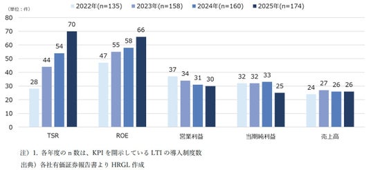 - 業績評価指標として採用されている財務指標をみると、STIでは営業利益(89件)や当期純利益(84件)、売上高(52件)といった利益や収益に関連する指標の採用が多い。LTIではTSR(70件)とROE(66件)の採用が特に多く、両指標とも年々採用件数が増加している