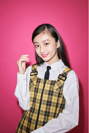 チェックのジャンパースカートと合わせてK-POPガールズ風スタイルに。