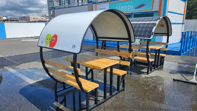 屋外特設会場・冒険ランド内「ガチャピン・ムックパーク」を中心に、屋根付きテーブルセットの「テーブルハウス」を提供させていただいています。こちらは屋外イベントやワーケーションのご利用に最適で、中には屋根にソーラー発電、そして座面の下に蓄電池を装着した近未来型ガーデンファニチャーもございます。こちらではお食事、休憩のみならず充電もしていただけます。