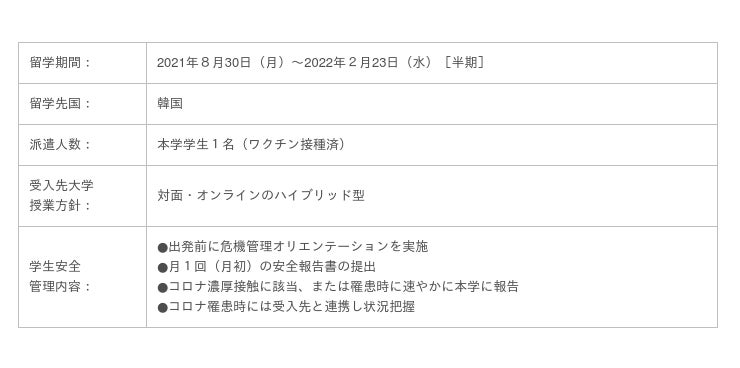 約1年半にわたり派遣留学を中止しておりましたが、学生に海外留学の機会を提供できるよう様々な検討を重ね、実施の判断に至りました。新型コロナウイルス変異株の流行等、不安要素もある中での派遣となりますが、学生が安全に留学生活を送ることができるよう常に状況を注視し、安全管理を徹底いたします。また、今後より多くの学生に留学の機会を提供できるよう段階的に留学プログラムの再開に向けた検討を進めて参ります。
