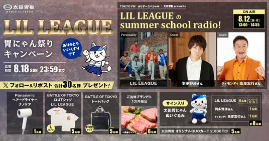 本キャンペーンは同社が提供している8月12日(祝・月)13:00~OAの「TOKYO FM ホリデースペシャル『太田胃散 presents LIL LEAGUEのsummer school radio!』」とのコラボ企画となっておりますので、ぜひ番組もお聴きください。