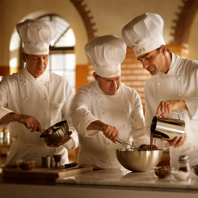 リンツでは、熟練した技を持つチョコレート職人のことを「メートル・ショコラティエ」と呼びます。現在リンツの本社を構えるスイスには、日々リンツの製品開発を行う6名のメートル・ショコラティエが在籍し、カカオ豆の厳選から、最高の風味を引き出すためにナッツを自社でローストし、キャラメルやヌガーも伝統的な方法で製造しています。