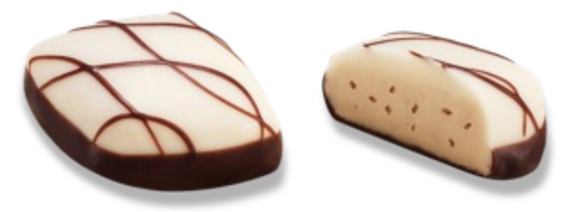 きめ細やかなホワイトチョコレートベースのジャンドゥーヤにアーモンドとサクサクのウエハースチップを加え、ホワイトチョコレートでコーティング。ダークチョコレートで丁寧にデコレーション。