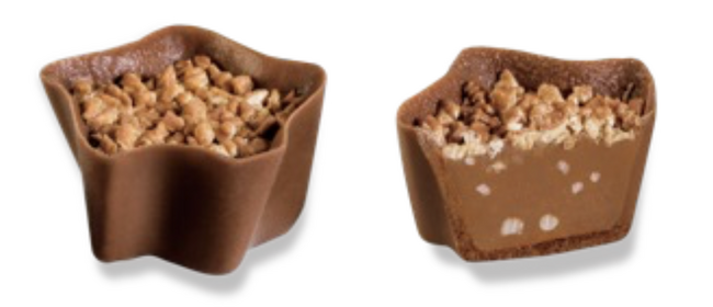 ミルクチョコレートにヘーゼルナッツのフィリングを入れ、カリカリのヘーゼルナッツをトッピングした星形のカップ入りチョコレート。ミルクチョコレートとヘーゼルナッツの贅沢な味わいをお楽しみいただけます。
