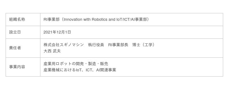 株式会社スギノマシン(富山県魚津市、代表取締役社長:杉野 良暁)は、ロボットやAIの活用による製造現場への付加価値の高い商品・サービスの開発や拡充を目的に、専門部署となるRI事業部(Innovation with Robotics and IoT/ICT/AI事業部)を2021年12月1日に設立いたします。