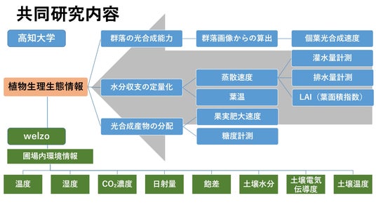 農園芸のイノベーションカンパニーwelzo(本社:福岡県福岡市博多区/代表取締役社長 金尾佳文)と、農学とデータサイエンス等との異分野融合による新たな学術「地域情報共創学」を先導する高知大学 IoP※1共創センター(センター長:北野雅治特任教授/所在地:高知県南国市物部)は、持続可能な農業への新しいアプローチとして、植物栽培における生理生態情報の定量的可視化に関する共同研究を開始しました。