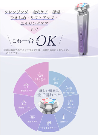 温冷ケア、EMS、光エステ、イオンクレンジング・イオンモイスチャーでお肌を全方位に集中ケア。