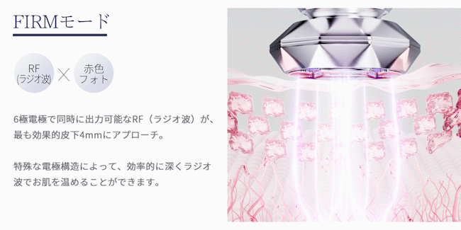 RF温冷美顔器は、独自技術のマルチポーラ式でRFラジオ波のエネルギーを最大4mmまで(皮下組織まで)、年齢肌の悩みに集中的アプローチ!面倒なステップなど必要ないので、肌の活力回復ができるのも特徴です。