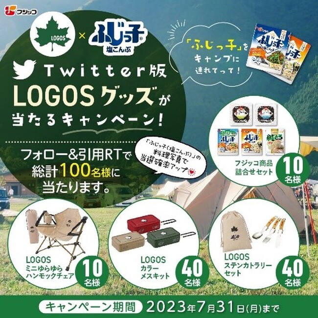 フジッコ株式会社(本社:神戸市中央区/代表取締役社長執行役員:福井正一)は、株式会社ロゴスコーポレーション(本社:大阪市住之江区/代表取締役社長:柴田茂樹)が展開する総合アウトドアブランドの「LOGOS」とコラボレーションしたアウトドアグッズが当たるキャンペーンを、2023年7月1日(土)より一部小売店にて実施いたします。本キャンペーンでは、「ふじっ子(塩こんぶ)」シリーズをご購入のお客様を対象に「ふじっ子」ロゴが入ったオリジナルアウトドアグッズを抽選でプレゼントいたします。