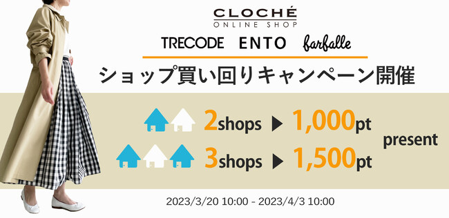 「ここち良さを、あたらしい視点から」を企業理念に掲げるレディースアパレルの株式会社クロシェ(代表取締役:沼部 健、本社:神戸市中央区=以下、クロシェ)では、自社のオリジナルブランド【farfalle/ファルファーレ】【TRECODE/トレコード】【ENTO/エント】の3ブランドの商品をクロシェオンラインショップで同時に購入すると、2ショップで1,000ポイント 、3ショップで1,500ポイント を付与する「ショップ買い回りキャンペーン」 を実施いたします。
