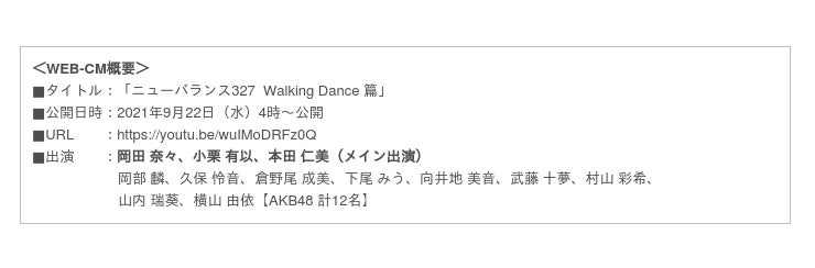 株式会社エービーシー・マート(本社:東京都渋谷区、代表取締役社長:野口実)は、アイドルグループAKB48 岡田 奈々、小栗 有以、本田 仁美 他を起用したWEB-CM「ニューバランス 327 Walking Dance 篇」を2021年9月22日(水)より公式YouTubeやABCマート公式サイトなどで公開いたします。WEB-CMの楽曲にはAKB48の約1年6ヶ月ぶりのリリースとなる58枚目シングル「根も葉もRumor」を起用しております。また、WEB-CM公開を記念して、購入者特典、先着でオリジナルフォトカードやアプリ抽選でSNAPBOOKが限定48名に当たるキャンペーンも実施いたします。