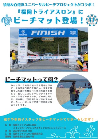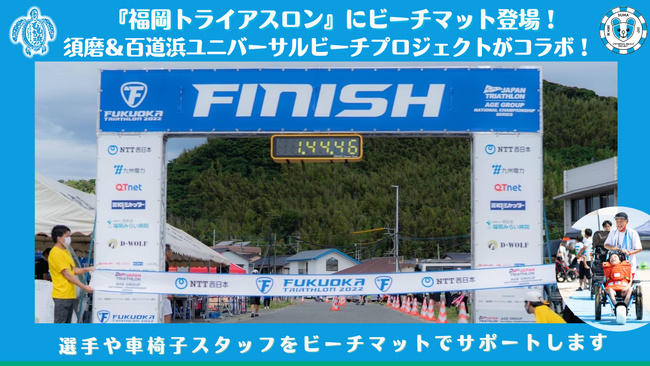 障がいがある人もない人もみんなが一緒に楽しめるビーチづくりを目指すNPO法人須磨ユニバーサルビーチプロジェクトは、「産・学・官」と地域社会を結びつけることでトライアスロンの普及を目指す福岡トライアスロンにて、6月25日(日)、選手や車椅子スタッフをサポートするためにビーチマットの設置を行います。