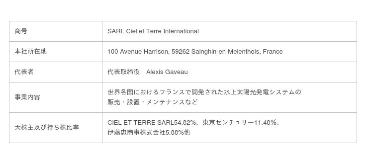 東京センチュリー株式会社(本社:東京都千代田区、代表取締役社長:野上誠、以下「東京センチュリー」)と、SARL Ciel et Terre International(本社:フランス、CEO:Alexis Gaveau、以下「シエル・テール」)は、株式会社Ciel Terre Japan(本社:東京都中央区、代表取締役:ステルフェルド・レミ・タケユキ、以下「シエル・テール・ジャパン」)が開発した日本の水上太陽光発電事業に東京センチュリーが参画することに合意いたしました。今後とも両社は、双方の強みを生かし、固定価格買取制度(FIT)を活用した協業の他、Feed-in Premium制度(FIP)やPPA等を活用した日本の水上太陽光発電市場における新たなビジネスの展開に注力することにより、カーボンニュートラルの実現に貢献してまいります。