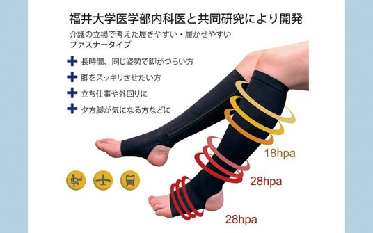 「患者の苦しみを解決したい」福井大学医学部内科医との共同研究による開発商品。介護の立場で考えた一般医療機器「段階着圧弾性ストッキング」が誕生。