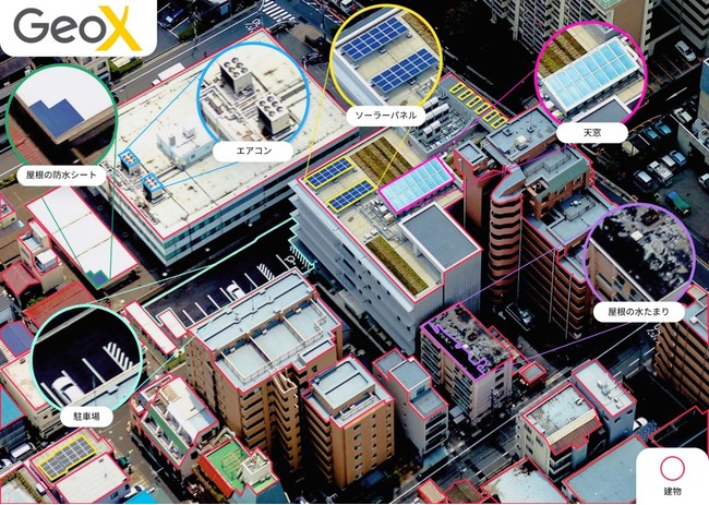 ジオエックス社はAIによる高度な3D地理空間画像解析技術を有し、海外の保険会社向けに企業物件や住宅物件を分析するためのソリューションを提供しており、保険引受や広域災害時の被害状況推定に活用されています。対象となる建物を含む航空写真や衛星写真から、屋根の種類、屋根形状、ソーラーパネルなどの屋上設置物設置有無(種類)、建物床面積などの建物に関する情報を瞬時に解析します。保険会社は航空写真や衛星写真から得た情報によりお客さまのリスクを精緻に評価し、お客さまに最適な保険商品・サービスをご提案することが可能になります。