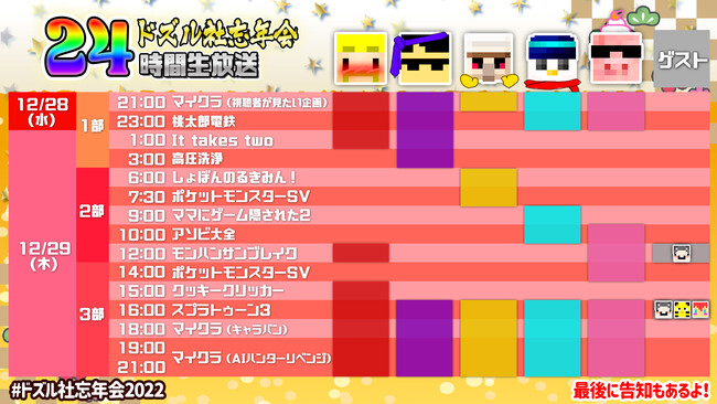 本生放送では、「Minecraft」や「ポケットモンスター スカーレット・バイオレット」「スプラトゥーン3」など、国内外で人気のゲームをドズル社メンバーが遊びつくし、24時間にわたりゲーム実況を配信して視聴者さんに今年1年の感謝の気持ちをお伝えします。