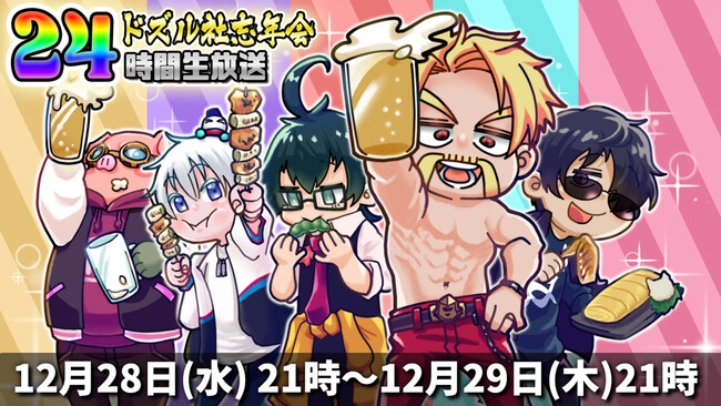 株式会社ドズル(以下、ドズル社 本社:東京都品川区、代表取締役社長:ドズル(YouTuber))は、ゲーム実況者グループ「ドズル社」メンバーの5人が、日頃の視聴者さんへの感謝を込めて、YouTubeチャンネル「ドズル社」の今年1年を振り返りながら人気ゲームを遊び尽くす生配信『ドズル社忘年会 24時間生放送』を、12月28日(水)21時より開催いたします。