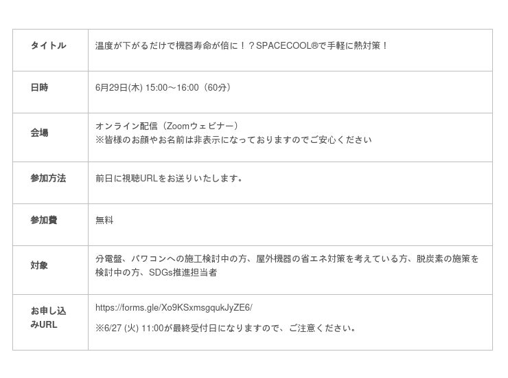 SPACECOOL 株式会社(代表取締役社長:宝珠山 卓志)は、COOL分電盤の製品化や実証実験にもご協力いただいたセイリツ工業株式会社様をお招きして、屋外機器への施工に関する疑問解消、脱炭素社会における省エネ対策をご紹介するウェビナーを6月29日(木)に開催します。