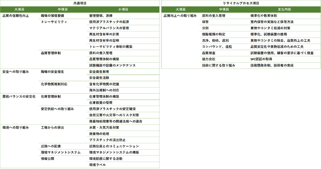 認証基準を定めた項目は、品質、安全、需給バランス、環境に関する「共通項目」および認証区分ごとの品質向上への取り組みを評価する「リサイクルプロセス項目」で構成され、これらの項目は、必須項目と加点的な内容である選択項目の2種類に分かれます。
