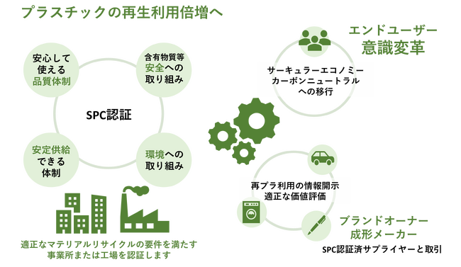 この度、「再生プラスチック資源価値創造プロジェクト(石塚化学産業株式会社(本社:東京都北区、代表取締役社長:石塚勝一)、いその株式会社(本社:愛知県名古屋市、代表取締役社長:磯野正幸)、株式会社近江物産(本社:滋賀県栗東市、代表取締役会長:芝原茂樹)、株式会社タイボー(本社:岐阜県安八郡、代表取締役社長:平野二十四)、一般社団法人サステナブル経営推進機構(本社:東京都千代田区、代表理事:壁谷武久、以下SuMPO))」は、プラスチックの再生利用倍増を目指したSPC(Sustainable Plastics Certification)認証プログラムを開発したことをお知らせします。