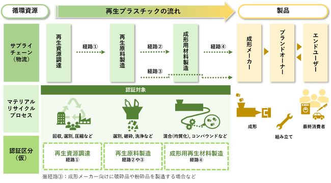 認証対象は、使用済プラスチック(Post-consumer recycled: PCR、Post-industrial recycled: PIR)を原料として再生プラスチックを製造するマテリアルリサイクルプロセスとします。SPC認証プログラムでは、このマテリアルリサイクルプロセスを「再生資源調達」、「再生原料製造」、「成形用再生材料製造」の3つの区分に分け、区分ごとの認証基準に照らして評価を行います。