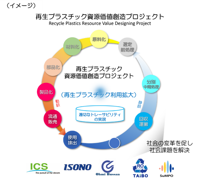 石塚化学産業株式会社、いその株式会社、株式会社近江物産、株式会社タイボー、SuMPOの5社は、2020年から共創事業として動静脈連携に向けた取り組みを行っており、2023年3月には事業連携協定の締結を発表し、再生プラスチックの利用拡大のための仕組みづくりを推進する「再生プラスチック資源価値創造プロジェクト」の活動を進めています。