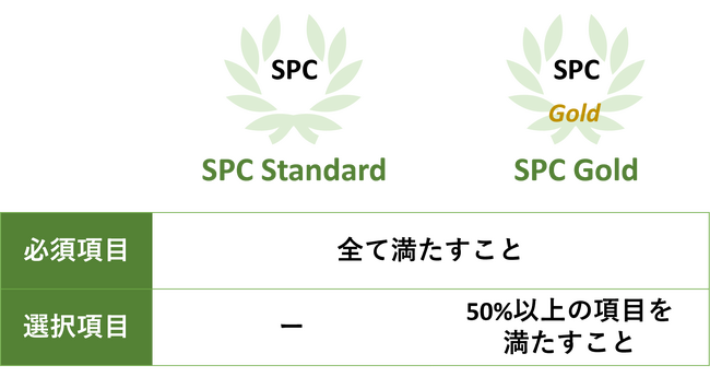 認証には、必須項目を全て満たすことで取得可能な「SPC Standard」に加えて、50%以上の選択項目を満たすことにより取得可能な「SPC Gold」という2つのレベルを設置し、事業者の取り組みをより評価に反映します。