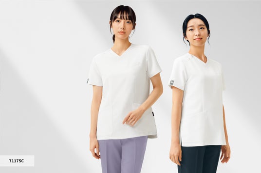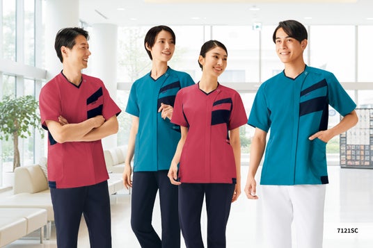 新作スクラブ7120SC、7121SCは、総合病院看護部向けに企画。男女で着やすいホワイト、ネイビー、ブルーに加え、男性も着られるピンクを用意しました。性別・年齢を選ばない、新しいフォークのピンク色です。ラグランスリーブが可動性と着心地の良さを提供、袖ぐりのゆとりが着脱を楽にします。胸元の斜め切り替えがスポーティーな印象です。