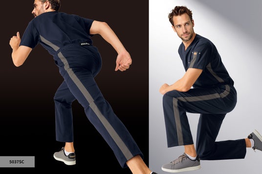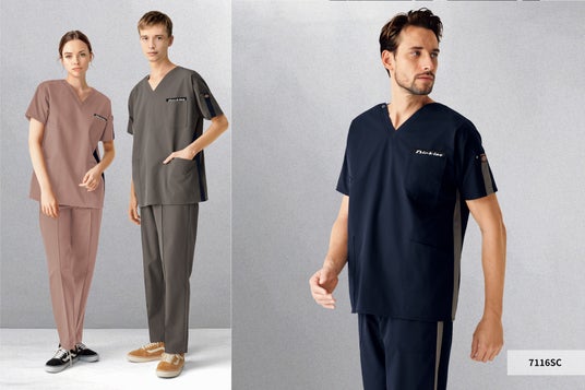 Dickiesシリーズからは、スクラブ1型(7116SC)とパンツ1型(5037SC)とドクターコート1型(1544LF)が登場。スクラブの胸ポケット部分とパンツの後腰部分に新しいDickiesのロゴテープを配置し、さりげないおしゃれを演出。また、左側にだけ入れたラインはパンツとの上下コーディネートを楽しんでいただけます。