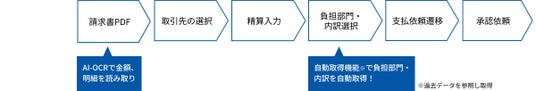 この機能により、請求書内容(取引日、明細、金額、取引先名、振込先情報、住所、適格請求書発行事業者登録番号など)を正確に読み取り、支払依頼伝票へ自動転記できます。