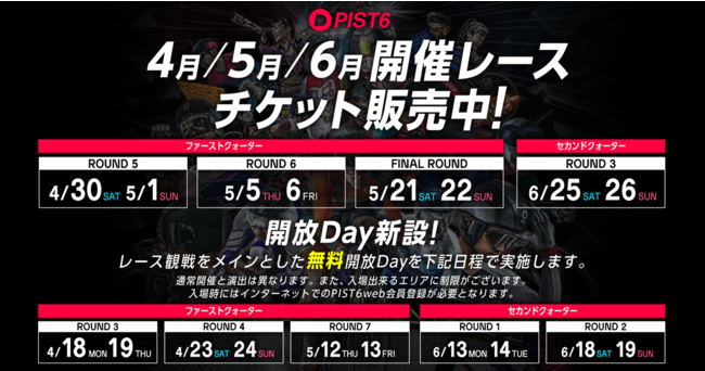千葉市主催の自転車トラックトーナメント「PIST6 Championship(以下、PIST6)」では、4~6月に開催する以下対象レースのチケットを4月15日(金)15:00より販売開始いたします。また、PIST6会員登録をしていただいた皆様に、4~6月開催レースのチケット購入時に使える「チケット50%OFFクーポン」をプレゼントいたします。