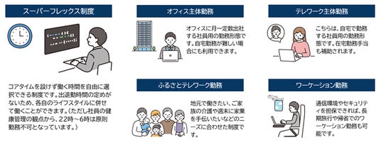 業務に支障がない限り、自宅などで仕事をすることができます。通勤時間の負担軽減や生産性向上のために制度を導入しています。新型コロナウイルス感染症の発生以降、多くの社員がテレワーク勤務を主体としています。また業務で必要な場合や気分転換のために出社することも可能です。