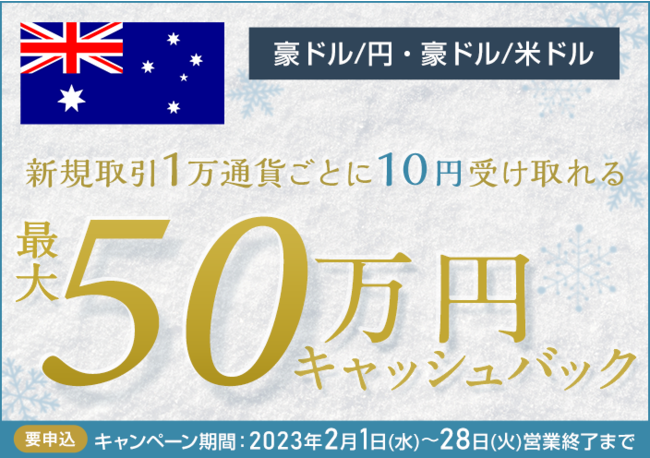キャンペーンに申し込まれたお客さまに、期間中における豪ドル/円と豪ドル/米ドルの新規取引合計数量に応じて、最大500,000円をキャッシュバックします。