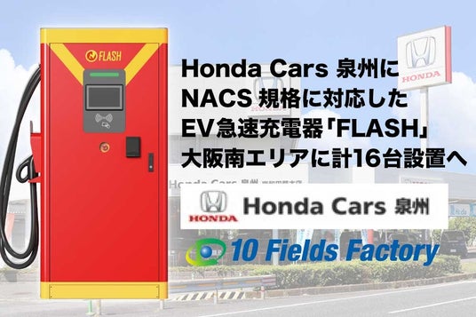 テンフィールズファクトリー株式会社(所在地:京都府相楽郡精華町光台1-7 けいはんなプラザ9F、代表取締役:市川 裕)は、株式会社ホンダ泉州販売(本社:和泉市肥子町2-8-56 代表者:大塚 雅仁)が運営する大阪府内の各店舗において、EV急速充電器「FLASH」を設置し、順次稼働を開始することをお知らせいたします。