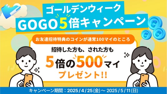 歩くだけでコインがたまり、たまったコインを「PayPayポイント」や「Amazonギフトカード」などと交換することができるスマホアプリ「アルコイン」を提供する株式会社Agoop(アグープ、本社:東京都渋谷区、社長:加藤有祐)は、「アルコイン」をご利用のお客さまがお友だちやご家族などを「アルコイン」に招待していただくと、招待した人と招待された人それぞれに、通常の5倍のボーナスコインがもらえる「ゴールデンウィークGOGO5倍キャンペーン」を2025年4月25日から2025年5月11日まで開催します。