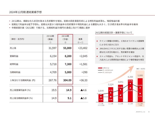 順調な仕入状況を踏まえ、2024年12月期は、売却案件の増加により、増収増益となる予想です。利益率についても、引き続き高い水準を維持する見込みです。
