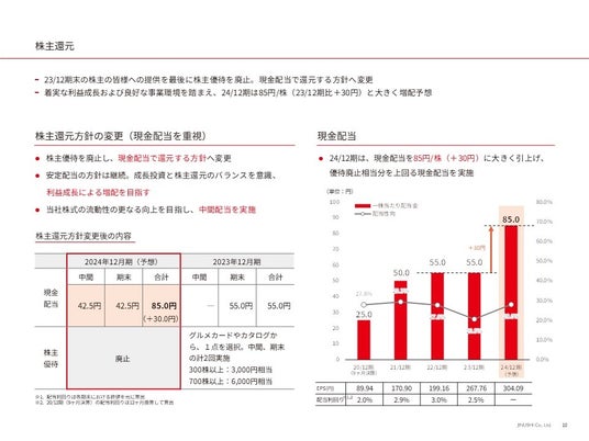 2023年12月期末の株主の皆様への提供を最後に、株主優待制度を廃止し、株主還元を現金配当に集約する方針といたしました。併せて、中間配当を実施いたします。着実な利益成長や良好な事業環境を踏まえ、2024年12月期の年間配当金は85円/株(2023年12月期比+30円/株)を予想しております。