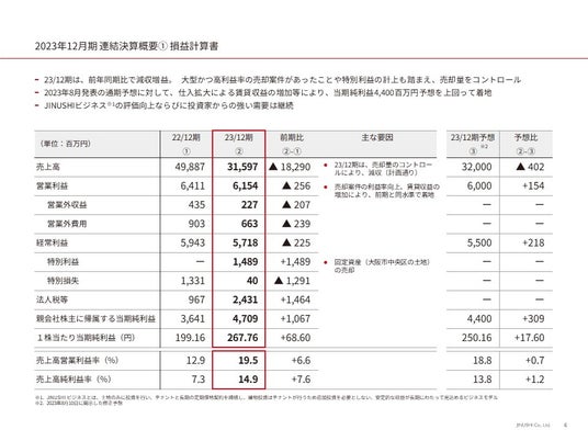 2023年12月期は、大型かつ高利益率の売却案件があったことや特別利益の計上を踏まえ、販売用不動産の売却量をコントロールし、計画通り減収増益となりました。好調な仕入れによって賃貸収益が増加した結果、当期純利益は4,709百万円と、2023年8月に公表した連結業績予想4,400百万円を上回って着地しております。