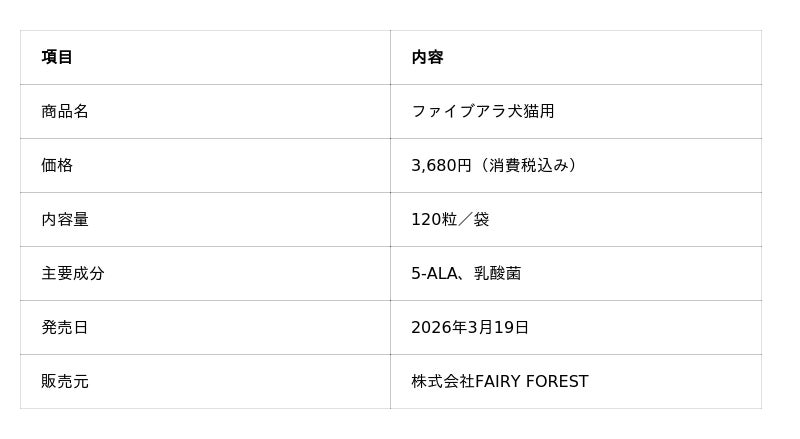 このたび、当社連結子会社の株式会社ハンドレッドイヤーズが製造を行い、同じく当社連 結子会社の株式会社 FAIRY FOREST が販売を担う、新たなペット用サプリメント『ファイ ブアラ犬猫用』を 2026 年 3 月 19 日より発売することをお知らせいたします。