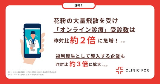 対面診療とオンライン診療を提供するクリニックフォアグループ(以下、クリニックフォア)は、2026年のスギ花粉シーズンにおけるオンライン診療の受診動向について速報でお知らせします。「オンライン花粉症診療」(※1)は、2026年2月の受診数が昨対比約2倍に急増(※2)しました。一部エリアでは例年以上の花粉量増加が見込まれる中、さらなる受診数の増加が予想されます。